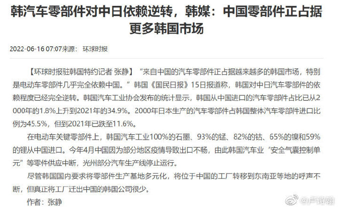 一个信息是,中国的汽车零部件正越来越多的占领其他国家市场,比如韩国就表示,从中国进口的汽车零部件占比已经从 2000 年的 1.8% 上升到 2021 年的 34.9%。