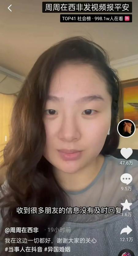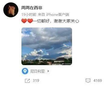 事情的经过很简单:三天前,20.岁的网红周周宣布要跟非洲丈夫回尼日利亚,并发布了在机场和海关的照片。昨天深夜,周周在社交媒体更新了状态,人在西非,一切都好。