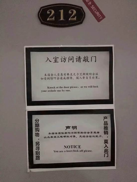 我的朋友马振强当时不堪其扰,试图用宿舍门口的贴纸威吓趣分期推销员。