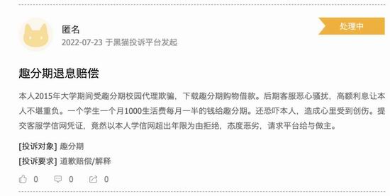 在黑猫投诉等平台上,有人诉说着自己每个月.1000.元的生活费,一半要给趣分期。