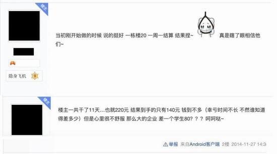 这些校园兼职者日子并不好过,有人发文说,讲好的一栋楼.20.块,最后趣店还克扣我.80.块工资。