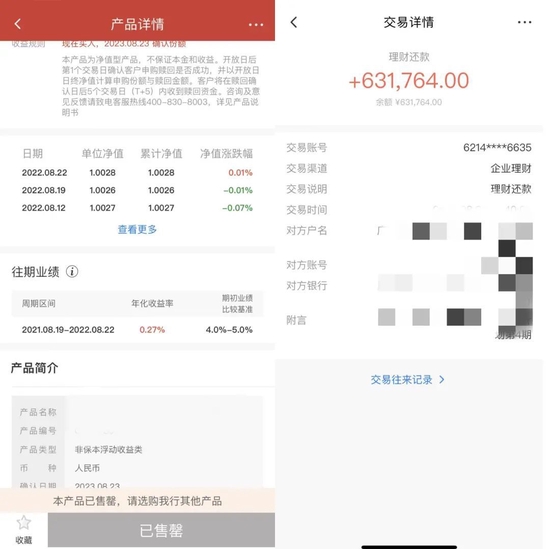 美洋购买的银行理财页面和到账的本金及收益 / 受访者供图