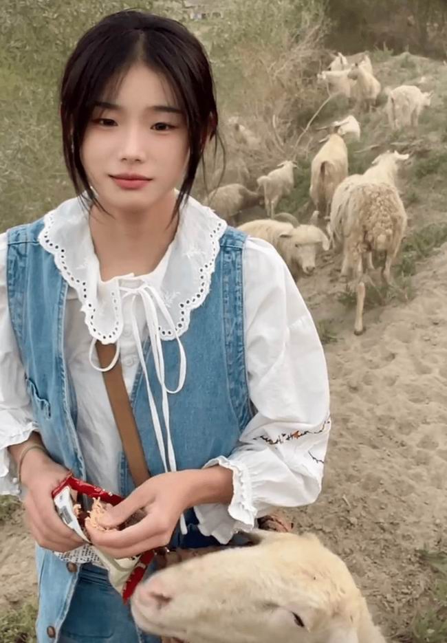 面容清秀的牧羊女(对,当时路人还不知道她会噶羊)拆开一包方便面,有贪吃的小羊不自觉凑了过来;