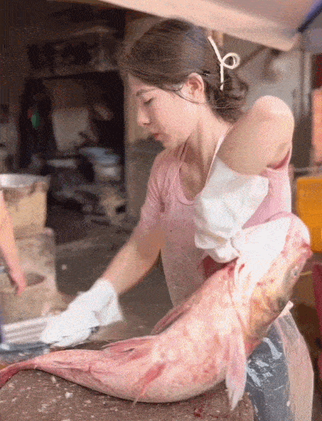 在污水横流、鱼鳞乱飞的卖鱼摊背景下,她那精心染过的发丝、淡粉色的.T.恤和妆容,都显得极其格格不入。