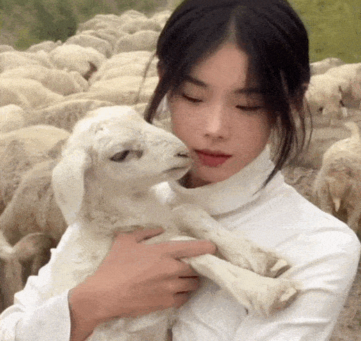 你看下图这位身穿白上衣的少女怀抱一只小羊羔,发丝温柔地垂在脸侧,好一副人与自然其乐融融的画面。