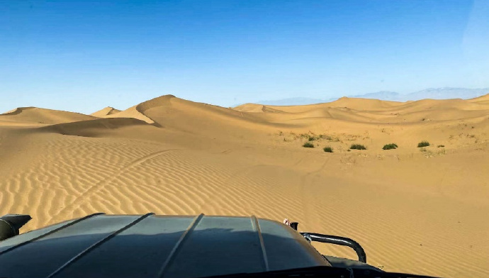 坐上老吉普,从公路旁的护网缺口拐进沙漠。翻过一座座高低起伏的沙丘,经过起伏摇晃、颠来倒去的路程后,连绵的沙丘退去,成片的小绿洲映入眼帘。