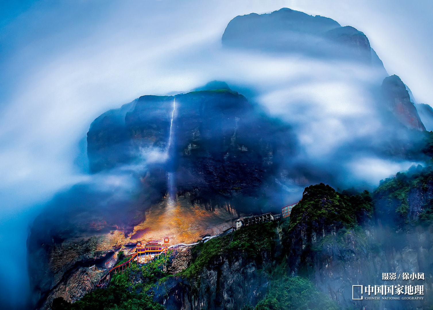 崖嶂,是一种顶部平坦,侧面发育陡崖的巨厚流纹岩层地貌,其宽度一般大于 50 米。和柱峰一样,它们都是火山塌陷形成破火山后,在破火山内形成的一种火山岩层景观。图中,一条落差达 300 米瀑布悬空而下,直直地挂立在崖壁之上,与凌空而建的灵通寺构成了一幅美画。
