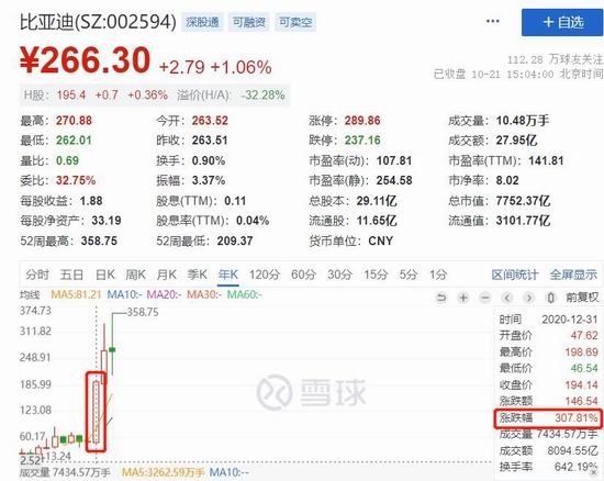 2020-2021 年,是比亚迪股价的腾飞年代, 2020 年当年就翻了 3 倍。