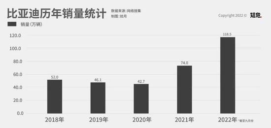 2018 年,比亚迪的汽车( 燃油、混动、新能源加总 )年销量达到 52 万辆,2019 年和 2020 年销量下滑,逐渐降至 42.7 万辆。但到 2021 年,比亚迪新能源汽车销量暴涨,年销量增长到 73 万辆。