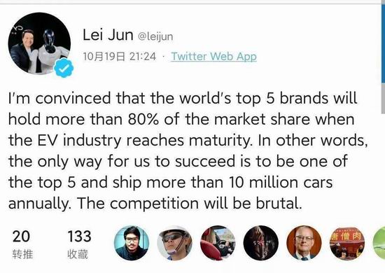 10 月 19 日,小米创始人雷军在 Twitter 上说, “我们成功的唯一途径是成为行业前五,并且每年出货量超过 1000 万辆。”
