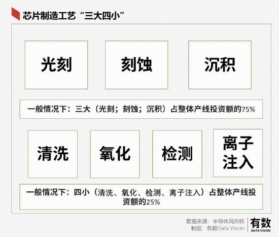 再比如,除去光刻之外,一颗芯片的制造还需要许多其他环节的配合。半导体前 7 道工艺环节按照设备产线投资,可以分为 “三大四小” 七个环节,光刻、刻蚀、沉积这三大是重中之重。