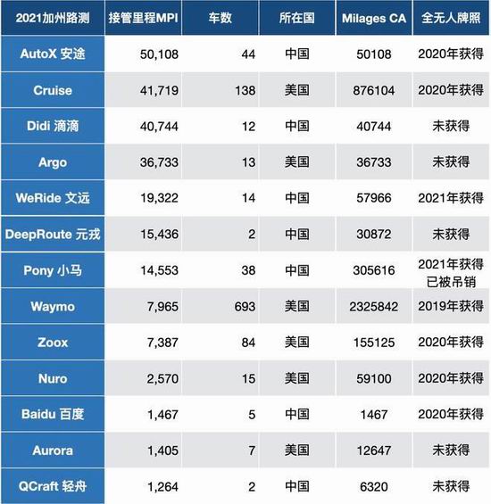 咱看看高阶自动驾驶的战况就知道了,在.2021.年加州交通管理局发布的自动驾驶路测数据里,可以发现上榜的全是?中美企业。