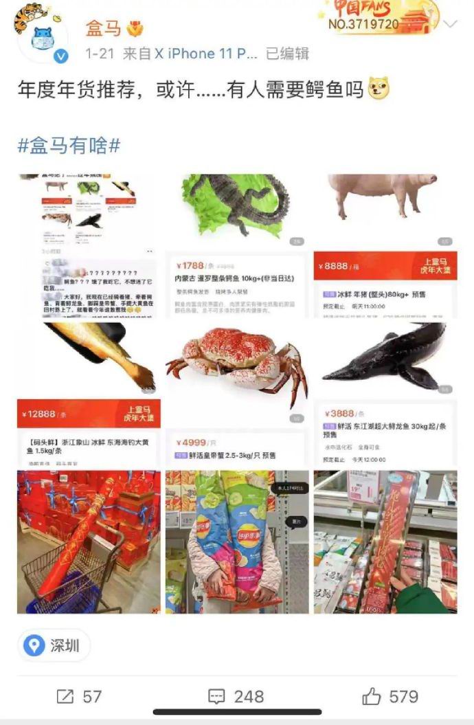 去年春节,盒马发微博卖年货,推荐产品有猪肉、大黄鱼、皇帝蟹,还有一整条内蒙古鳄鱼,看起来像只大壁虎趴在生菜上。