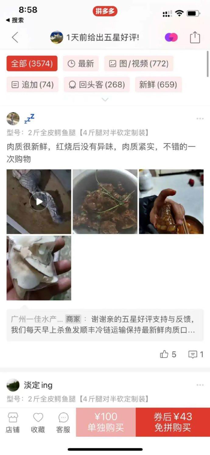 拼多多上卖鳄鱼肉的网店很多,销量最多的卖出了.10.万.+,从评论区看,许多都是老顾客回购,他们晒出红烧鳄鱼腿的照片,在评论里和其他鳄鱼爱好者交流烹饪方法,丝毫不顾凶狠鳄鱼的尊严。