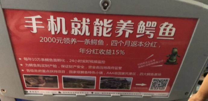 前几年网上还有「云养鳄鱼」的项目,花.2000.在网上领养一只鳄鱼,就有人在线下替你养,鳄鱼长大后可以选择领走鳄鱼,也可以选择委托基地销售,还能换养殖基地里等价的鳄鱼周边,号称.“4.个月回本,年化收益.15%”。