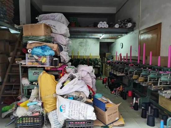 这些厂通常人数最多,一间有 6-8 个员工,都是女工,年纪偏大,40 岁以上。几台缝纫机排列开,女工戴着帽子在伏案操作。为何戴帽子?大概是怕长头发卷进缝纫机吧。