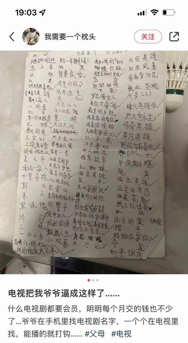 比如有的人说,爷爷被电视的会员机制逼疯了,把电视剧写在纸上,能播的就打钩。