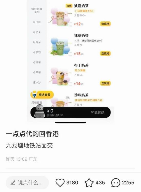“除了香港街边饭店里的港式奶茶,奶茶店里卖的奶茶基本上都是又贵又难喝。可能也有好喝的,但是价格也是上天,还没有珍珠之类的小料。” 对他们来说,两杯深圳的奶茶加上代购费直接送达家门的价格,相当于他们自己出门在香港买一杯奶茶的价格,而且料更多。