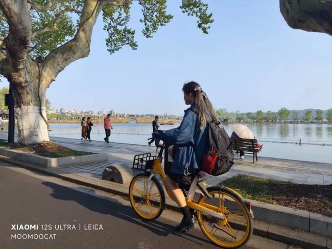 最后这张是临走出租车上拍远处的断桥,恰有青春靓丽的骑车小妹妹入镜,其实我手机里还有一张更清楚的断桥,但我还是选了这张 po 给你们看。西湖之美,独特在于历史人文的韵味,若没有生活在西湖边上的人相衬,区区石桥湖水又有什么意思呢。