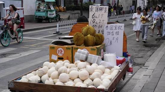 经常可以在路边看到一整排卖芒果、榴莲、西瓜、板栗、袜子、内衣、打火机、香烟…的小摊主们