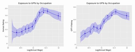 在 OpenAI 的那篇工作论文中,研究者发现了稳定的正相关关系 —— 工资越高的职业,被 GPT 们替代的可能性越高。这个趋势在年收入大于 10 万美元的职业之后才区域相反,见下图。