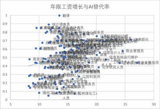 那么,从业年限的工资增长率,即这个工作的 “成长性”,和每个职业的 AI 替代率之间存在什么关系?