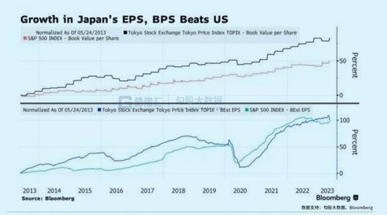 而尽管日经指数已经处于历史新高,但从估值来看,日股似乎还是相对便宜。相比于标普 500 指数和斯托克欧洲 600 指数 4 倍和 1.8 倍的市净率,日经指数的市净率只有 1.3 倍,估值相对较低。