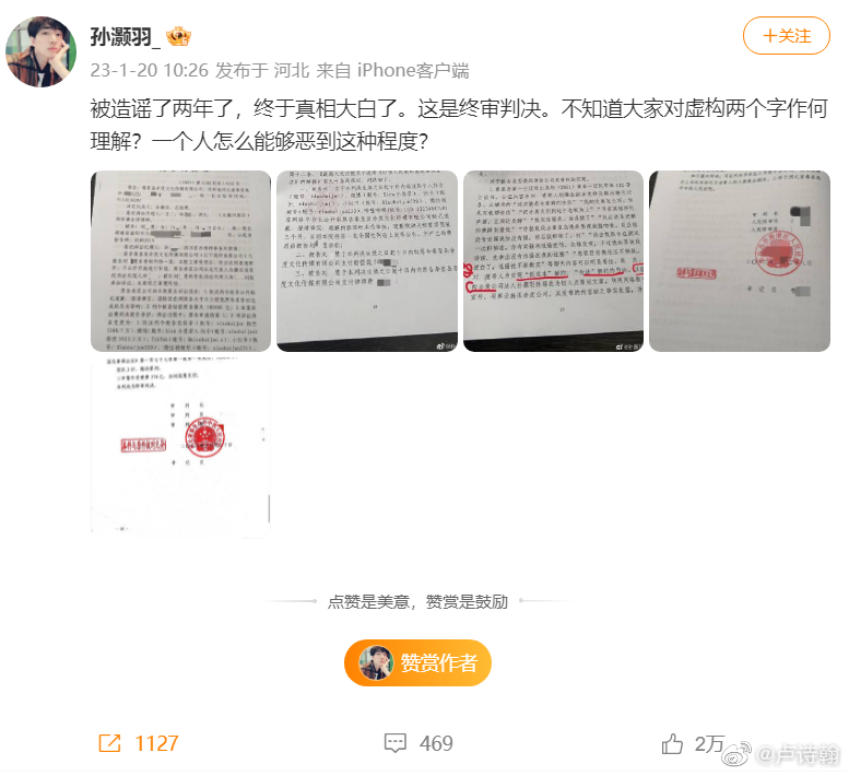 第二波,出现转折,发现是诬告后,热度立马消散。今年 1 月,被老板的老板孙灏羽在网上晒出法院判决书,这个够硬了吧,足够有说服力了吧?比小作文要实在一万倍吧?