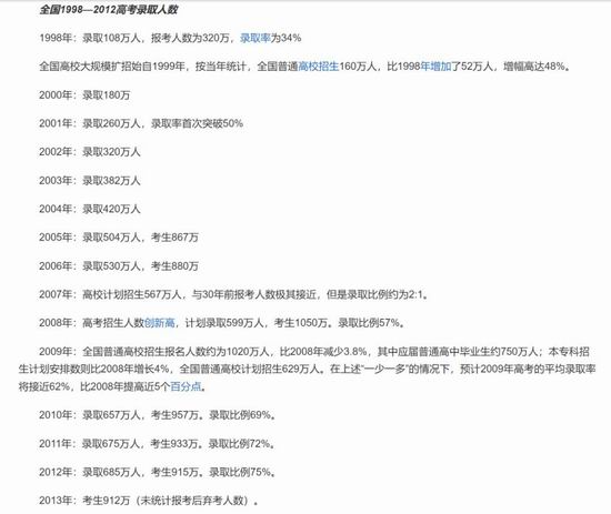但从 1999 年开始,全国高等院校开始进行大规模扩招。当年的高校招生人数,比上一年度增加了 40% 多。随后,全国的高校每年都进行扩招。我在百度百科上搜到一段全国 1998—2012 高考录取人数统计数据,截图如下,让大家感受一下过去这么多年的扩招速度。