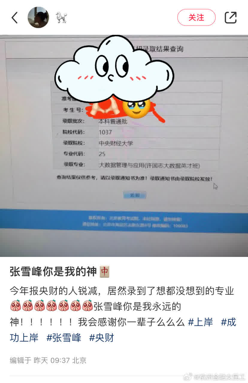 @杭州金融女民工:有位网友,发帖说非常感谢张雪峰,因为他说普通人家孩子别学金融财经,导致今年报中央财经大学的人数锐减,他正好捡了个漏,上了自己之前都不敢想的专业