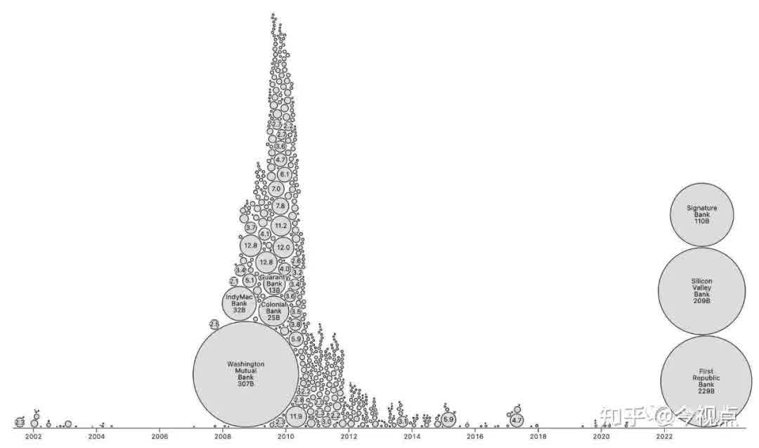 这里要多说一句美国的银行危机,美国银行总数很多,超过了4700家,每次发生经济危机,都有大量的倒闭,下图是近些年美国银行的倒闭情况,每个圆圈就是一家银行,圆圈越大、资产也就越大。