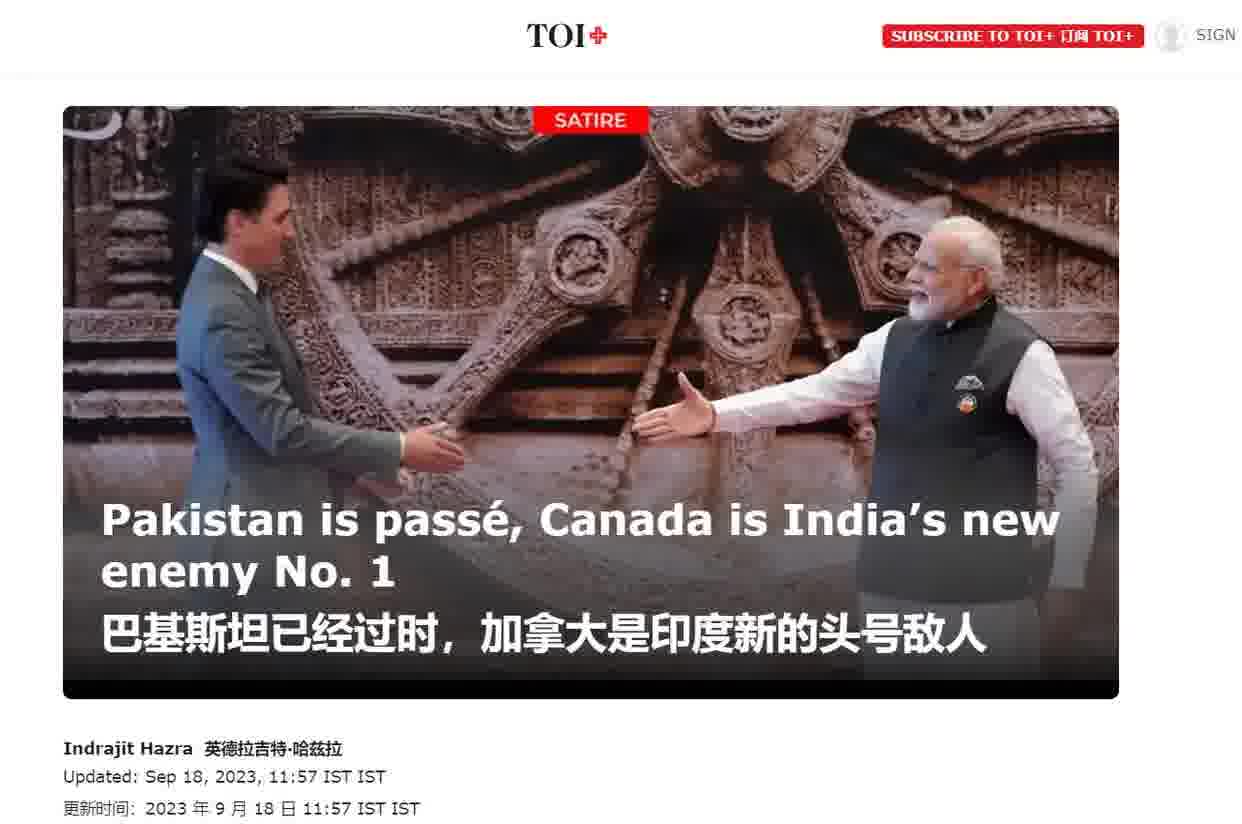 这两天我在网上看到了一条很是耐人寻味的新闻,一手信源是印度的主流媒体,亲国大党一派的《印度时报》,而它的标题是这样的:《巴基斯坦已经是过去时了,加拿大才是印度的头号敌人》