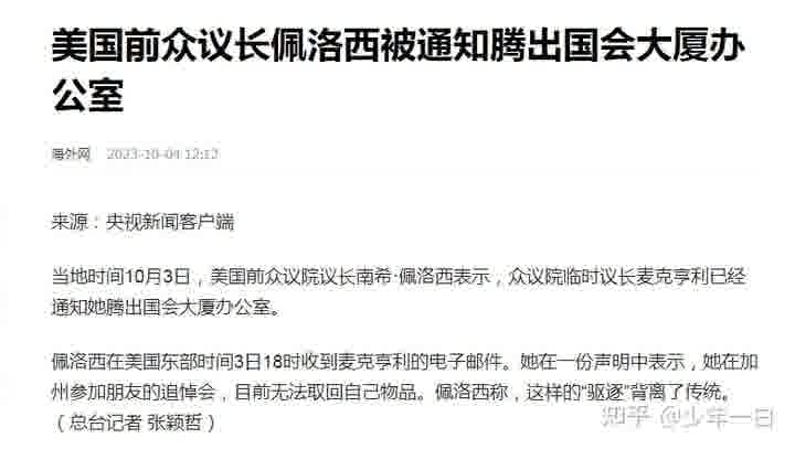 所以麦卡锡就选择了自己的好友众议员帕特里克·麦克亨利担任临时议长,麦克亨利上来第一件事让佩洛西把在国会大厦内的办公室腾出来。