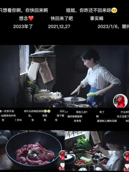 想念李子柒的粉丝们,依然在苦等。在抖音上,拥有 4897 万粉丝的李子柒账号,弹幕上仍有不少粉丝在催更。“2023 年快过完了,姐姐咋还不回来”“快回来了吧”“你什么时候回来呀”“期待回归”“想念李子柒的 800 个日夜”。在海外社交平台上,粉丝也一直在询问 “Where is Liziqi”。