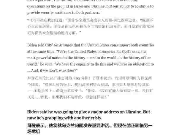 我能听出来,拜登这回是真急眼了,因为美国的公众舆论已经普遍不相信美国还有能力同时援助乌克兰和以色列了,否则他也不至于放下自己身为总统的架子,跑到CBS上来,给美国民众打“我们美国可是世界上有史以来最强大的国家啊”这种屁用没有的鸡血了。