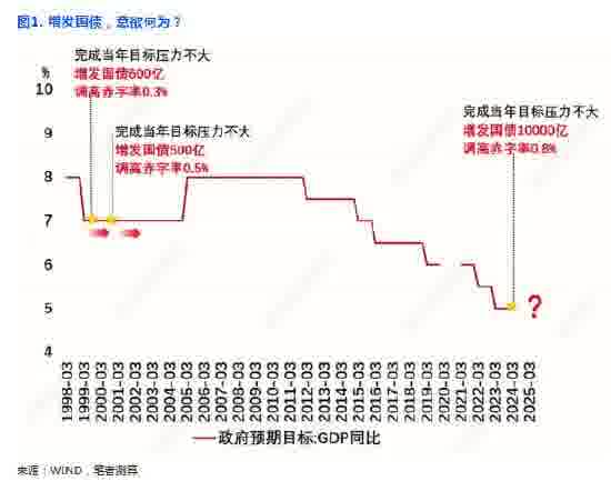 1999、2000年增发国债的经验表明,经济目标完成压力不大时追加预算,往往体现政策加码的决心,也预示下一年GDP目标有望保持稳定,难有明显下调。近期中央增发国债并上调赤字为2000年以来首次,且幅度明显高于历史。