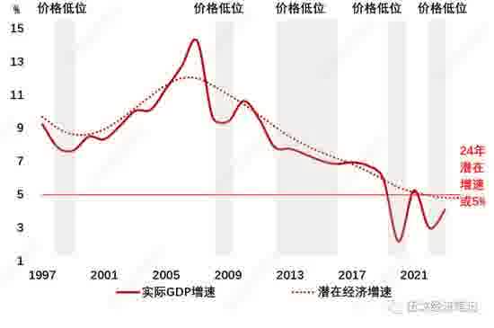 当前价格低迷的原因并非潜在增速的长期趋势下行,而是短期的负产出缺口,即今年的经济增速目标及实际增速低于潜在水平。根据历史趋势以及劳动力、资本等拟合,2024年我国潜在增速或接近5%左右。若能趋向该值,价格自然也能转正。