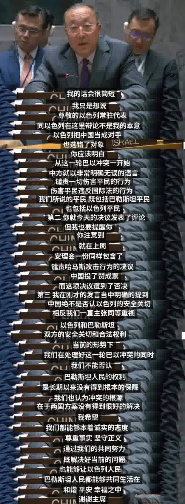 紧接着,中国代表张军也回应称:“我的话会很简短。我只是想说,尊敬的以色列常驻代表,同以色列在这里辩论,不是我的本意。以色列把中国当做对手,也选错了对象。你应该明白,从这轮巴以冲突一开始,中国就以非常明确无误的语言谴责一切伤害平民、违反国际法的行为。我们所说的平民,既包括巴勒斯坦平民,也包括以色列平民。”