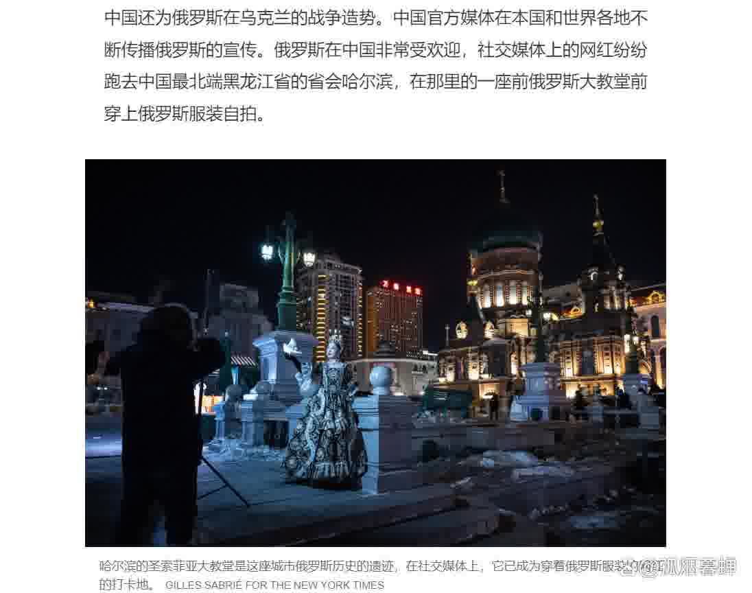 在俄乌冲突爆发之后,哈尔滨的圣索菲亚大教堂日渐成为中国社媒网红新的打卡胜地。现如今,不时就会有中国年轻人穿着带有浓厚俄罗斯风情的华丽服饰,来到圣索菲亚大教堂前拍照留影。虽然这种行为在我们中国人看来只道寻常,但有道是“嫉妒使人丑陋”啊,即便只是普普通通的留影打卡,在中俄关系不断升温的大背景的烘托之下,这样的影像投射在《纽约时报》那群编辑的眼睛里头,映照出来的俨然就是一副妒火中烧的扭曲景象。