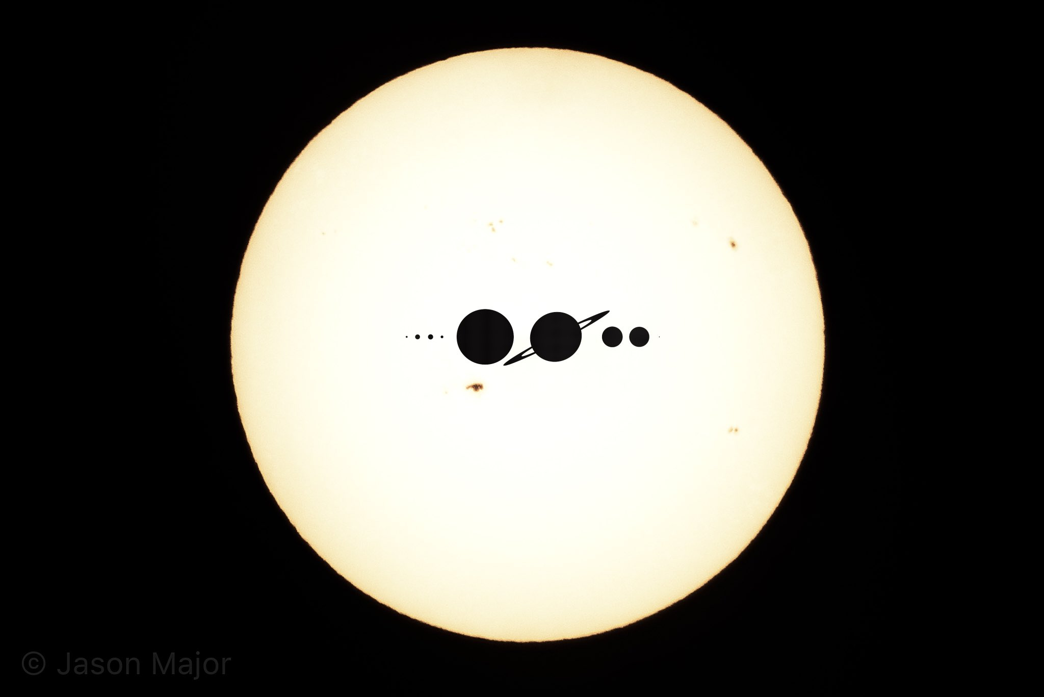 太阳系 99.86% 的质量都在太阳里,剩下的 0.14%,有 90% 都在木星和土星这两颗气态巨行星里。看看这张太阳系行星和太阳的大小对比图就知道,咱们地球(左数第三颗)是多么不起眼……