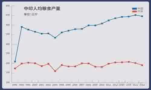 但1990年之后,中国的人均粮食产量遥遥领先,是印度的2.34倍左右。