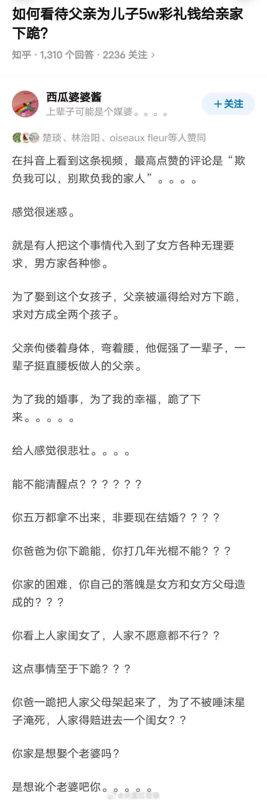 » 如何看待父亲为儿子5w彩礼钱给亲家下跪?