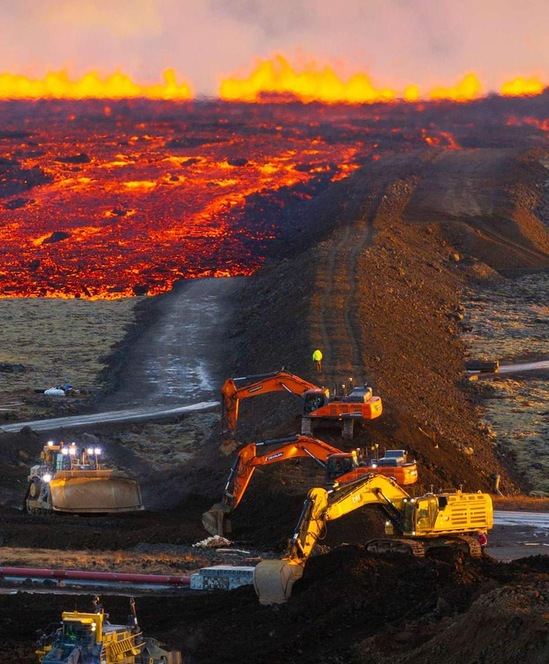 这是冰岛格林达维克在修建岩浆防护墙的照片。所谓的防护墙,其实就是用土堆起来的一道 “坝”,像拦洪水一样把岩浆拦在城外不让它流入城镇。