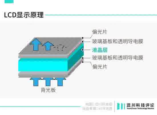 LCD 是一种背光显示技术,即依靠底部的背光层发光,通过液晶层来调节光线,与滤光片配合,呈现、变化不同的颜色。我们可以把背光层想象成一个手电筒,对着一扇百叶窗照射;通过调整百叶窗,来实现不同的光线效果。