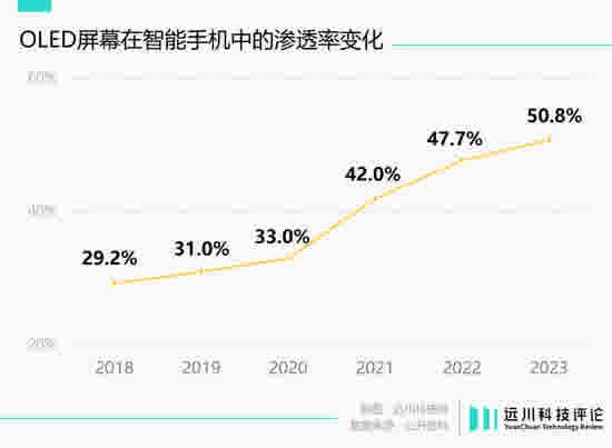 从 2018 年开始,越来越多的手机厂商也开始意识到 OLED 的重要性。例如在当时,华为手机的 OLED 屏幕采用率仅有 10%,如今已跃升至 60% 左右。隔壁的小米,也在过去 5 年时间,将采用率从个位数百分比提升至接近 50%。