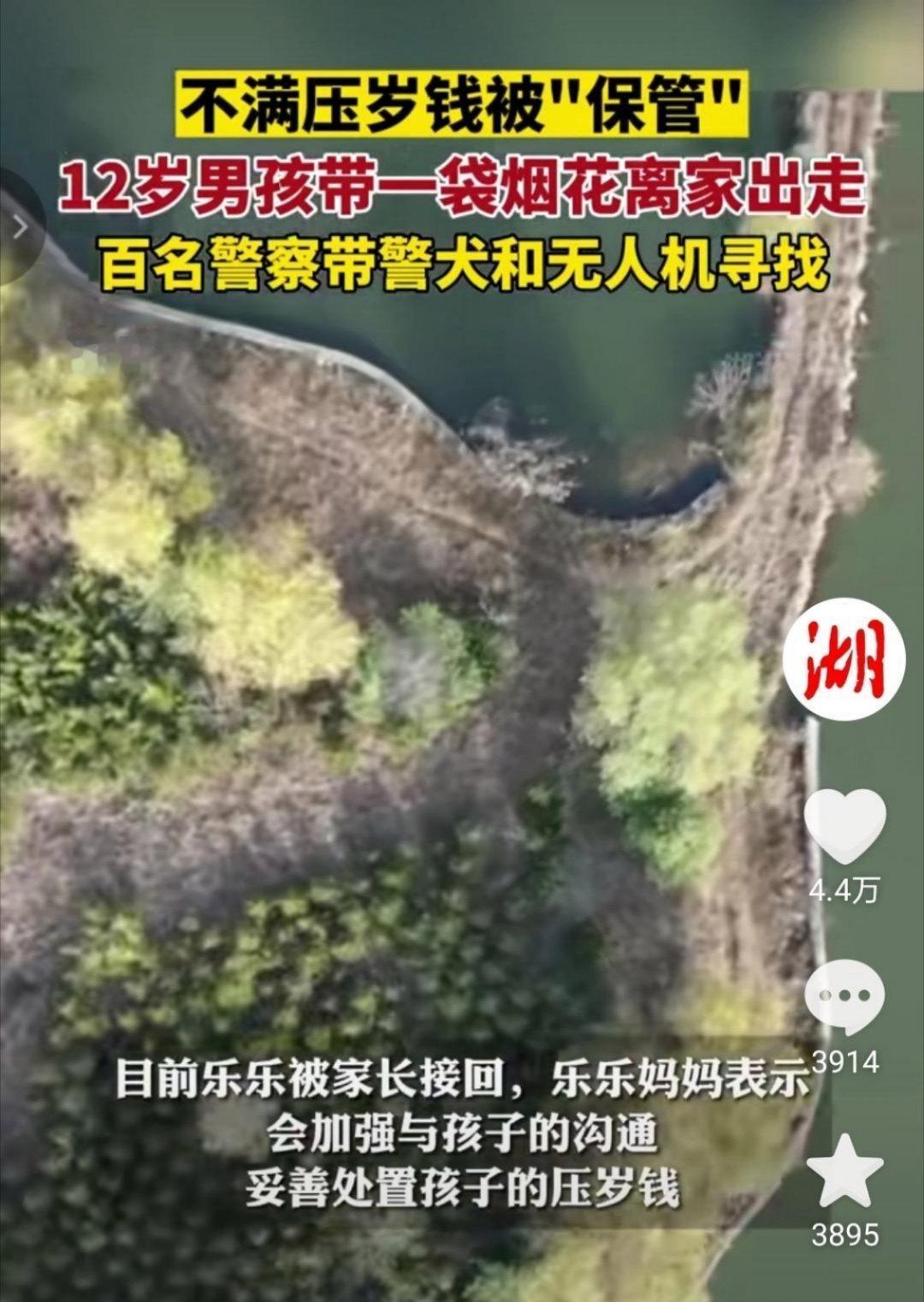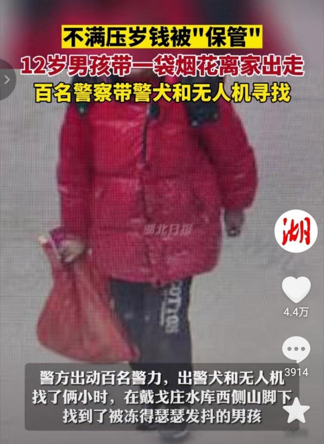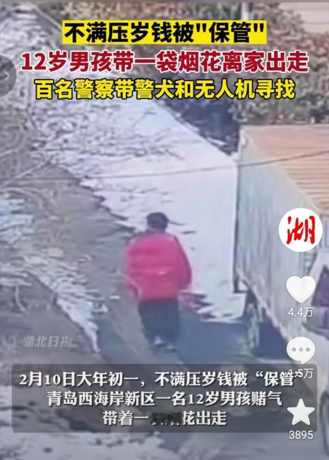 2月10日大年初一,青岛一名12岁男孩不满压岁钱被保管赌气离家出走,出走时带着一袋烟花,警方出动百名警力,出警犬和无人机,最后在山脚下找到了被冻得瑟瑟发抖的男孩。