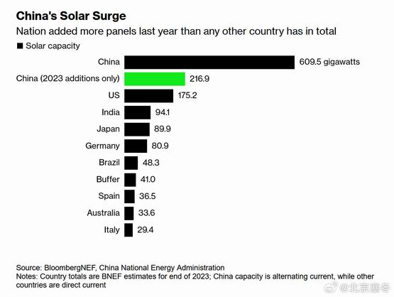 2023 年一年时间,我国新增太阳能光伏装机 216GW,超过美国历史光伏装机的总和(1 年干碎你 20 年)。