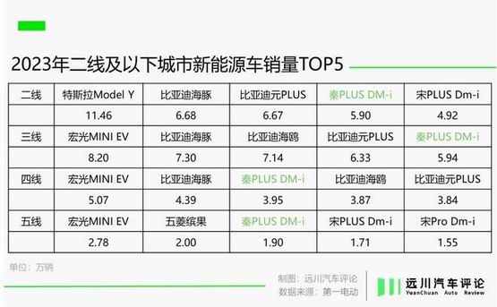 2023 年,降价后的秦 PLUS DM-i 狂卖 30 万辆,同比增长 63%,在二线及以下的新能源市场存在感极强,如果算上纯电版本,比亚迪秦系列的销量超过了 48 万辆,在 A 级轿车的细分市场登顶。