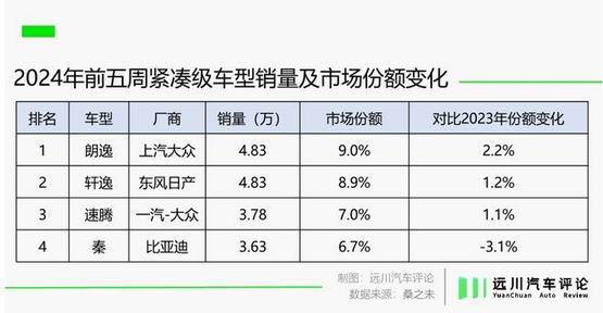 这种现象在数据层面更加明显,2024 年前五周,朗逸、轩逸、速腾等合资车型在紧凑级市场份额均出现回升,而比亚迪秦从榜首滑落至第四:
