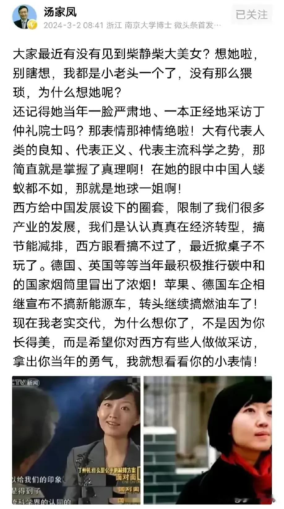 汤家凤挺想柴静的,还记得她以前采访丁仲礼院士的时候,那叫一个坚定自信。现在好多西方国家都不搞节能减排了,汤老师寻思着柴静能不能再去采访一下那些西方的专家,看看他们到底是咋想的。其实吧,那些公知当年对环保问题指指点点,就是想搞能源私有化,好让外国资本收购中国新能源产业。好在咱聪明,没上他们的当,坚持住了自己的立场。